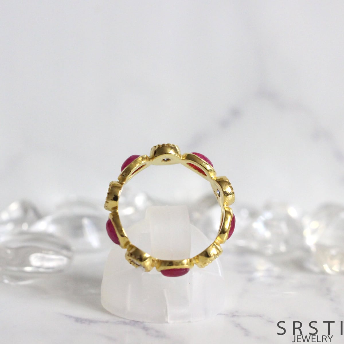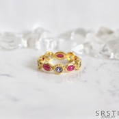 こちらのリングは美しいルビーと神秘的なタンザナイトを交互に並べたエタニティリングです。鮮やかな赤色のルビーと、絶妙な青紫色のタンザナイトがリズミカルに配置され、K18ゴールドプレートでより華やかにしました。