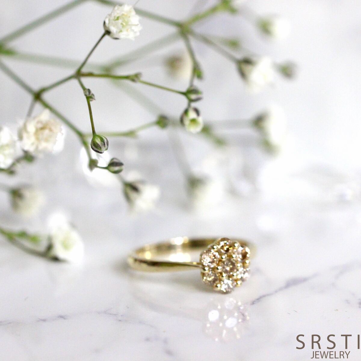 直径約2mmのダイヤモンドを7石、花が咲くように寄り添わせて留めたフラワークラスターリングです。