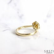 イエローゴールドのあたたかみのある色合いが、ダイヤモンドの透明感を引き立て、アンティーク調ながらもシンプルさを併せ持つどこか懐かしさを感じる佇まいに仕上がりました。